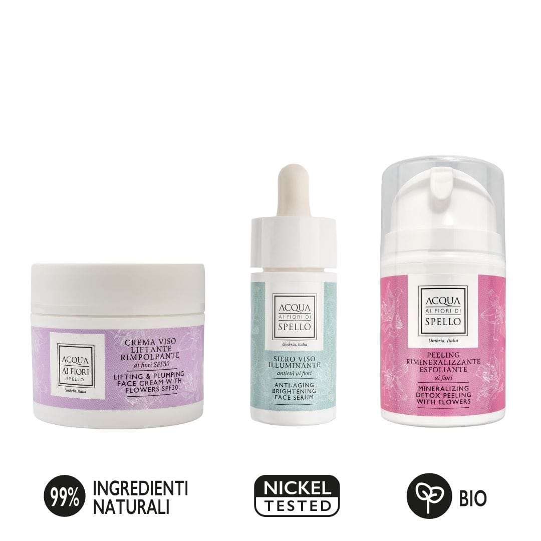Il siero illuminante, ricco di estratti floreali, dona luminosità e setosità, ed è perfetto per ogni tipo di pelle, sia al mattino che alla sera.